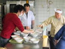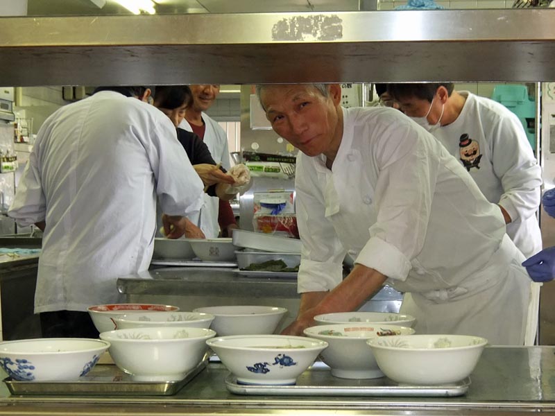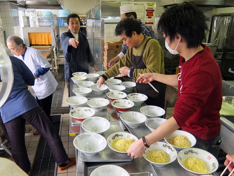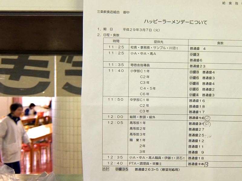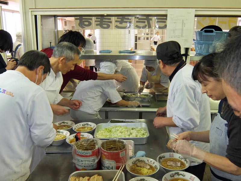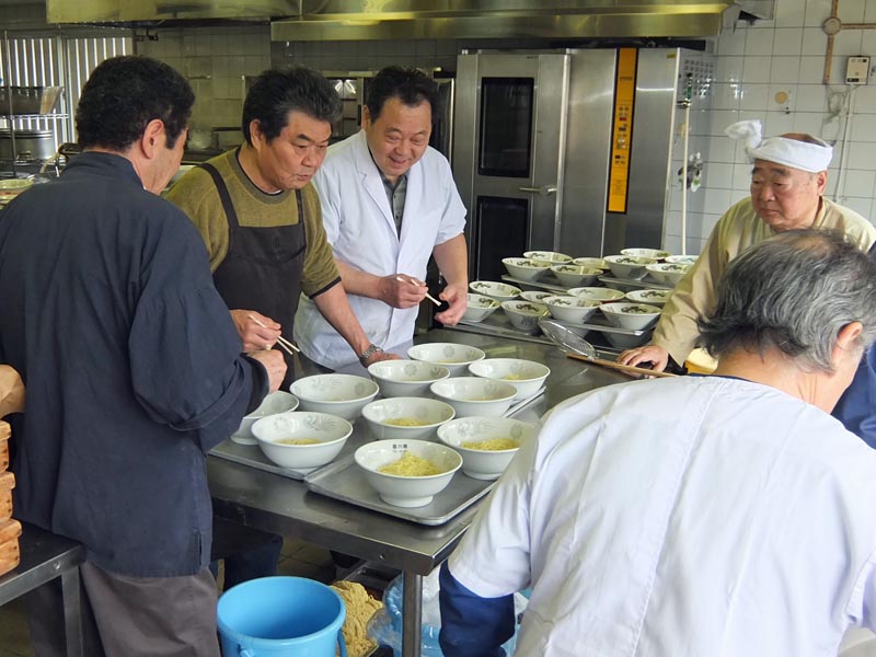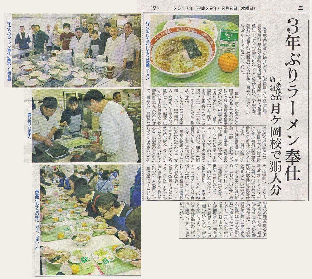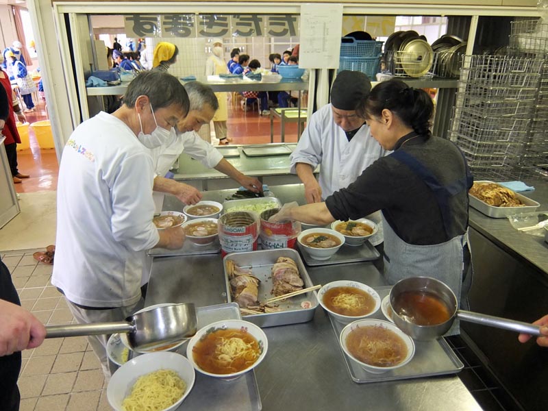 ![]() 三条飲食店組合による県立三条特別支援学校へのラーメン奉仕慰問が3年振りに行われた。 同組合では、3年前まで35年連続でこの慰問を行っており仕事は慣れたもの。 朝9時からスープの仕込みに入ると次々に応援の組合員が集まり、手際良く材料の切込みを行い 冗談も出るほどに和気あいあいと仕事が進む。 奉仕するラーメンの数は、盛替え分を予想した350食を用意した。 取材担当は、生憎営業時間が近づいた為、ラーメンの提供前に現場を離れる羽目に・・・・ < その後の状況は、8日付の三条新聞の記事から > ![]() 《 関連情報 ケンオウ ドットコム 》 |
