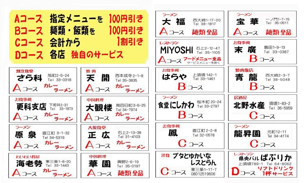 協賛店名 Aコース 割烹食堂 さら科 焼肉 天開 お食事処 更科支店 中国料理 大観楼 ラーメン 原泉 大衆食堂 正広 わいわい肴屋 海老勢 中国料理 華園 ラーメン 大福 ラーメン 宝華 レストラン MIYOSHI Bコース 御食事処 はらや お食事処 末廣 ラーメン 食堂にしかわ 焼肉飯店 青龍 Cコース お食事処 鳳 居酒屋 北野水産 洋食 ブタとゆかいなレスとらん ラーメン 龍昇園 Dコース レストラン 県央バル ぱぷりか |