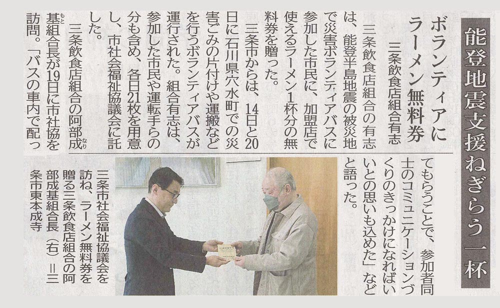 1/1 に発生した能登半島地震被災地の復旧が徐々に進み 道路状況が回復してきたことで県外からのボランティアの受け入れが始まった。 三条市でも被災地ボランティアを募集し 2/14 と 2/20 の両日 被災地にボンティアを派遣した。 三条飲食店組合では ボランティア活動に参加する人達(総勢21名)に感謝の気持ちを伝えるためボランティア終了後に 『心を込めた一杯』を提供し 労をねぎらい疲れを癒してもらう無料食事券を用意した。 2回目派遣前日の19日 阿部組合長が三条市社会福祉事務所(笹川浩志事務局長)を訪れ前回の14日に続き食事券を届けた。 その際 笹川事務局長から『前回参加したボランティアの方から当組合の素晴らし取り組みに感謝の言葉をいただいている。』との報告を受けた。 阿部組合長は『三条飲食店組合では東日本大震災の際にもボランティアに参加した人たちに無料食事券を提供しており こうしたた取り組みが被災地ボランティアの励みとなり また 他団体にも広がることを願い今後も【ボランティア応援団】として活動して行きたい。』と話した。 関連記事 こちら と こちら |