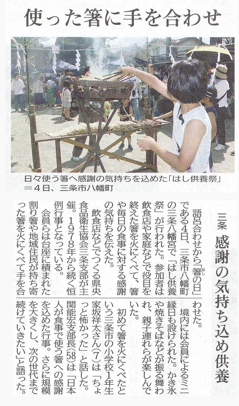 8月4日 三条市八幡宮(藤崎重康宮司)において 県央食品衛生協会三条支部(以下“”)が主催する恒例の『箸供養祭』が開催され 多くの親子連れで賑わいを見せた。