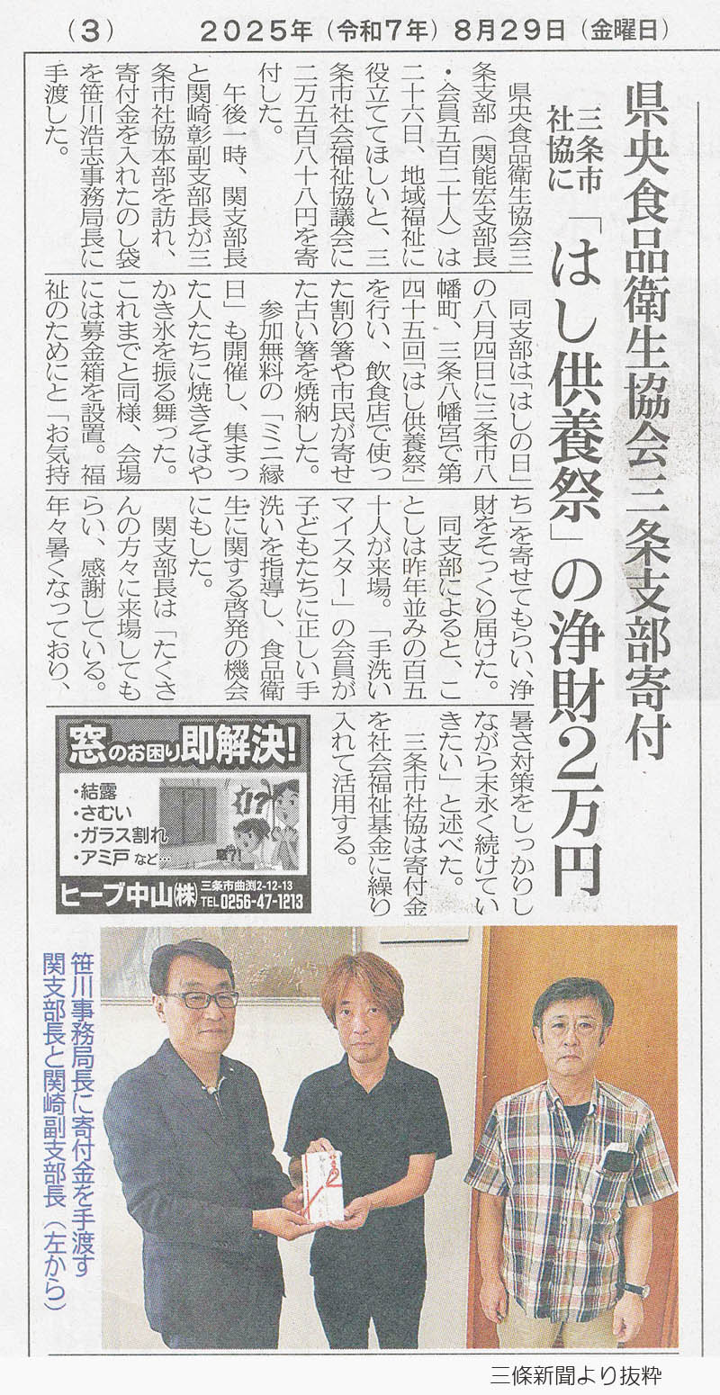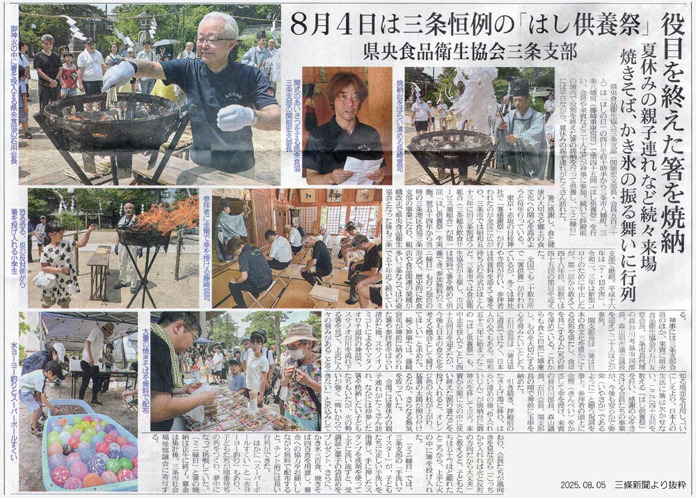 県央食品衛生協会三条支部が主催する恒例の『箸供養祭』が開催され 食協会員や訪れた一般市民が持ち寄った使用済みの箸を焼納し 日頃食事で使う箸に感謝し供養の気持ちを表した。