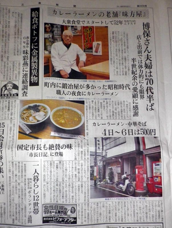 4日 商売の大先輩・味方屋さんが今年一杯で廃業するという報道が地元紙三条新聞に掲載された。